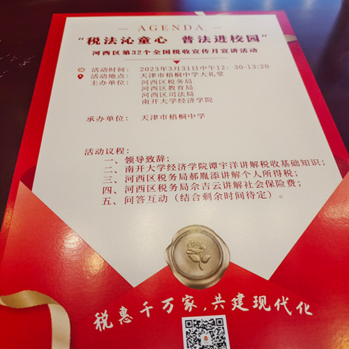 为普及税法知识、增强广大群众的爱税、护税及纳税意识,国家税务总局天津市河西区税务局等单位联合beat365亚洲体育,围绕“税惠千万家·共建现代化”主题,于3月31日在梧桐中学开展第32个全国税收宣传月启动仪式。河西区税务局局长蔡进、河西区司法局局长赵金力、河西区教育局副局长田玮等出席,梧桐中学师生近300人参加了现场活动。beat365亚洲体育税务专业研究生谭宇洋参与了本次活动并进行了税收相关基础知识的宣讲。