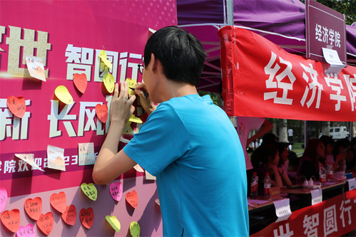 迎新现场,新生们排队领取一卡通、新生材料、公司文化衫等物品并完成扫码报到。报到完成后,新生们来到迎新展板前写下对老员工活的期待。公司还制作了样式丰富的手持拍照板作为道具,邀请每名新生与陪同家长合影留念,留下在南开的第一张照片。“青春芳华,亭亭而立”“越山向海,逐梦追光”“确认过眼神,是经院的人”“为中华之崛起而读书”“我是爱南开的”一系列标语兼具南开特色与经院特色,备受新生喜爱。