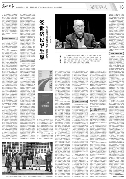 关于商品经济、价值规律和市场经济的研究,在谷书堂的学术生涯中占了相当大的比重。今天,当我们对这位在经济学领域奋斗了70余年的学者的经济思想进行过系统研究之后,不难发现,假如他的整个学术思想是一座大厦,那么,他关于商品经济、价值规律和社会主义市场经济的论述则是这座大厦的基石和骨架。